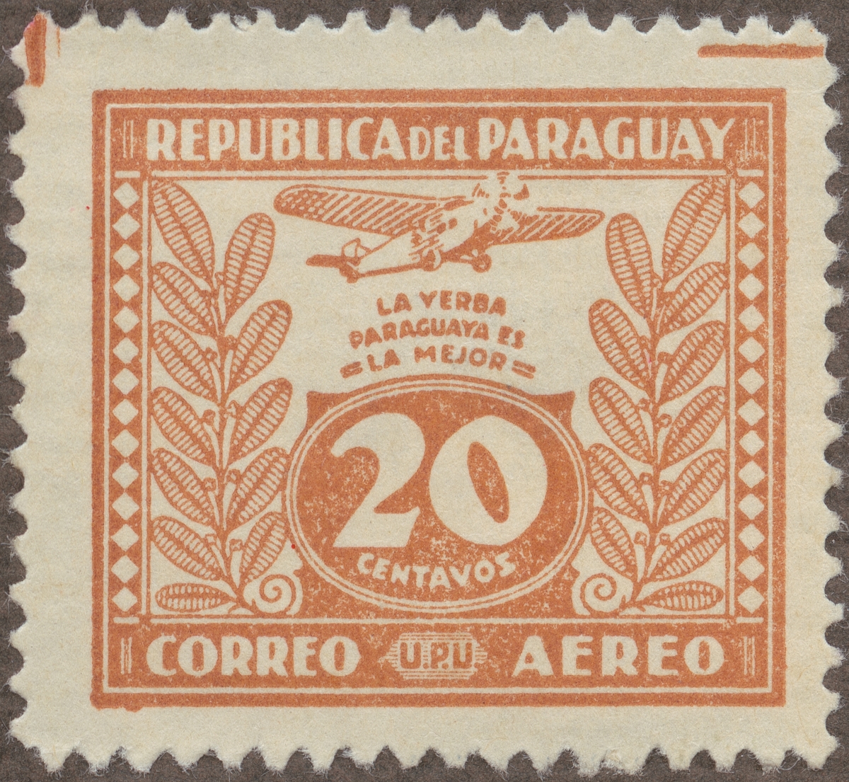 Frimärke från Paraguay, 1931. Motiv av Enmotorigt monoplan "-Stiliserad Yerba Maté planta: Sydamerikas nationella örtthé. (inskription: "Paraguay:s Yerba är den bästa.")"