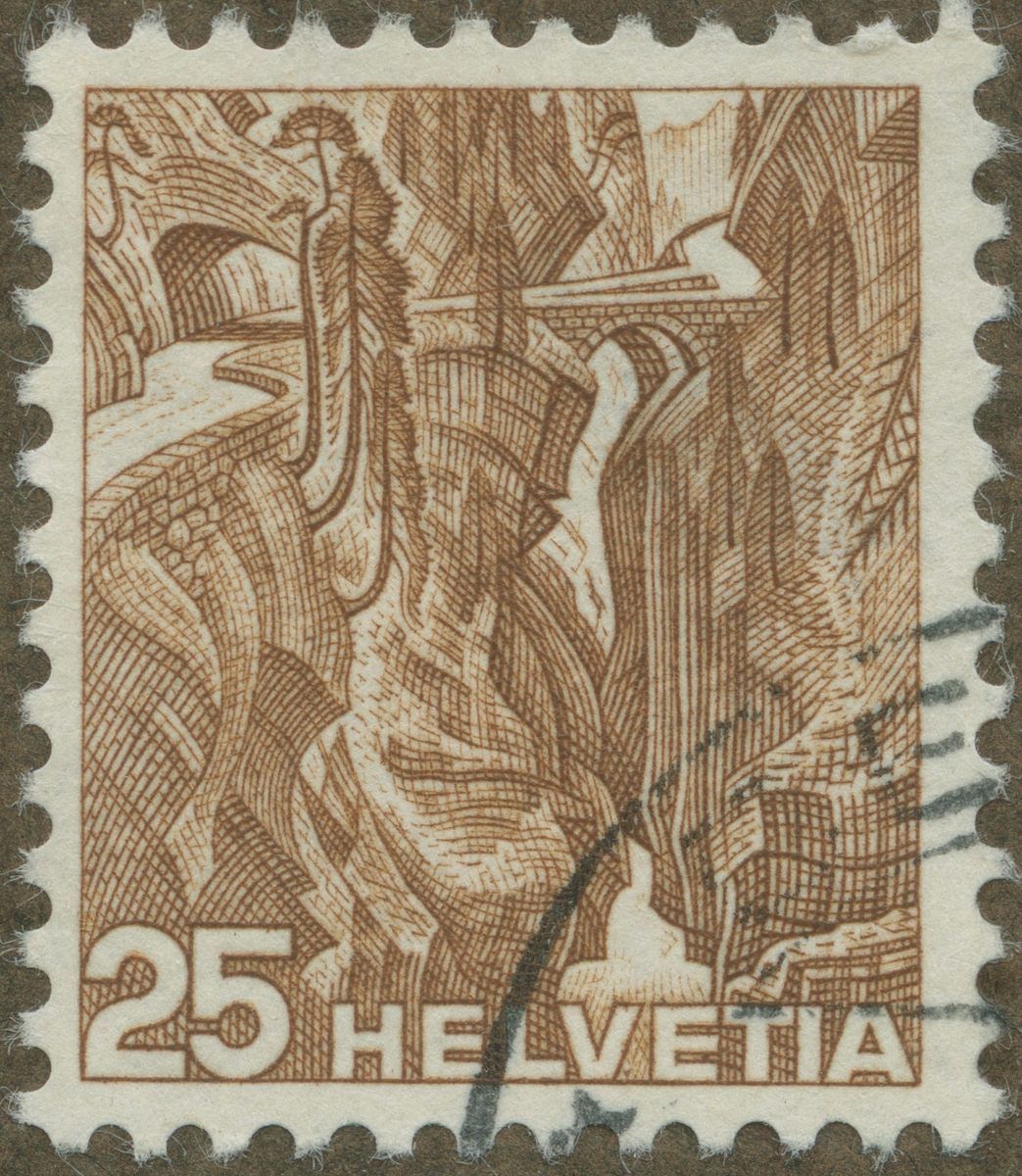 Frimärke ur Gösta Bodmans filatelistiska motivsamling, påbörjad 1950. Frimärke från Schweiz, 1936. Motiv av "den s.k. "Via mala" (Den farliga vägen) i Schweiz"