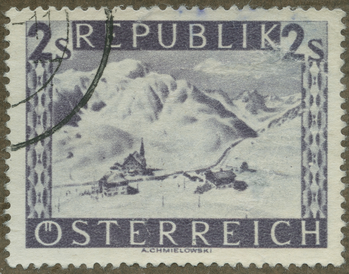 Frimärke ur Gösta Bodmans filatelistiska motivsamling, påbörjad 1950. Frimärke från Österrike, 1945. Motiv av Saint Christophe i Arlberg