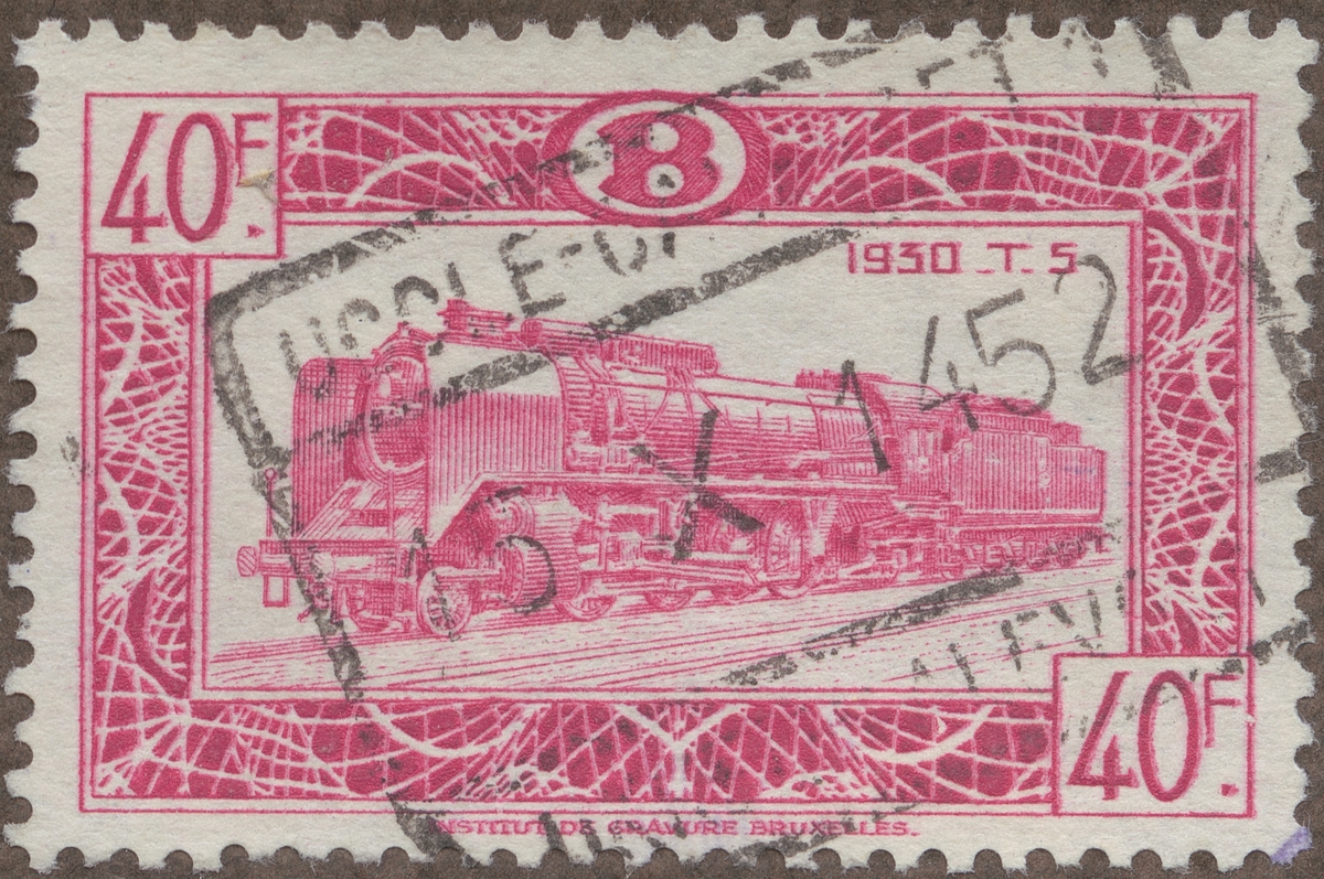 Frimärken ur Gösta Bodmans filatelistiska motivsamling, påbörjad 1950. Frimärke från Belgien, 1949. Motiv med Lokomotiv Belgien 1930 T 5