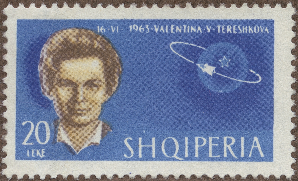 Frimärke från Albanien, 1963. Motiv av Första kvinnliga astronaut: Rymdresa: 16 juni 1963: Valentina V. Treshkova från Ryssland "-Astronaut Serie-"