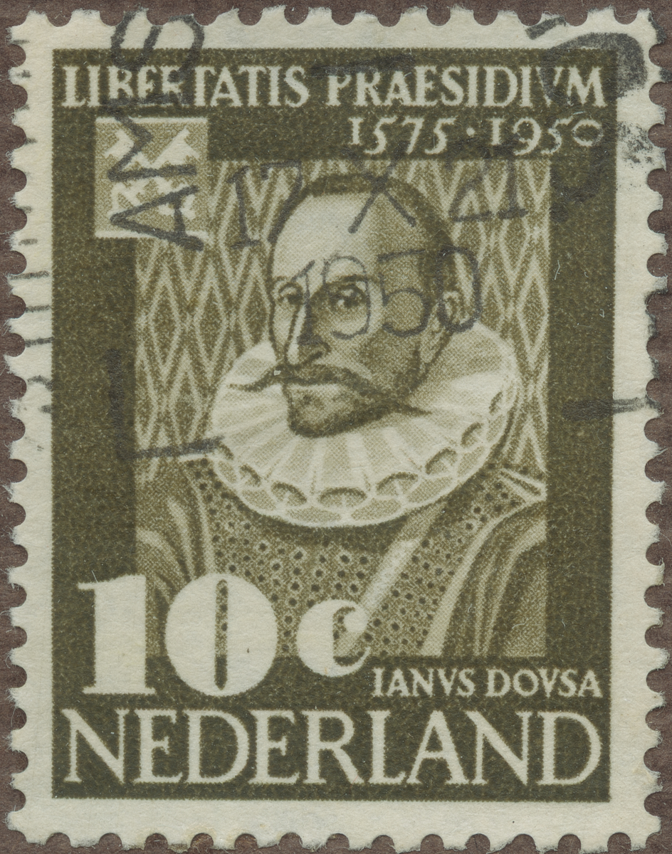 Frimärke från Nederländerna, 1950. Motiv av Janus van der Dousa 1545-1609 Den förste "Curatorn" när Leydenuniveritetet grundades Universitetet 375 år 1575-1950