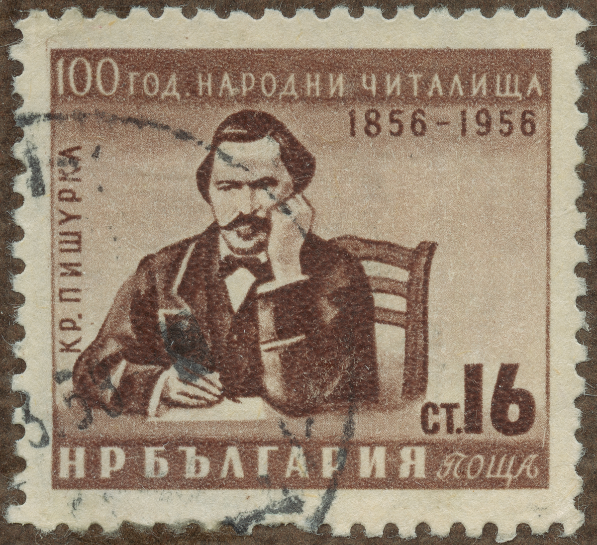 Frimärke från Bulgarien, 1956. Motiv av K. Pichurka 100-årsminne av folkbiblioteken 1856-1956
