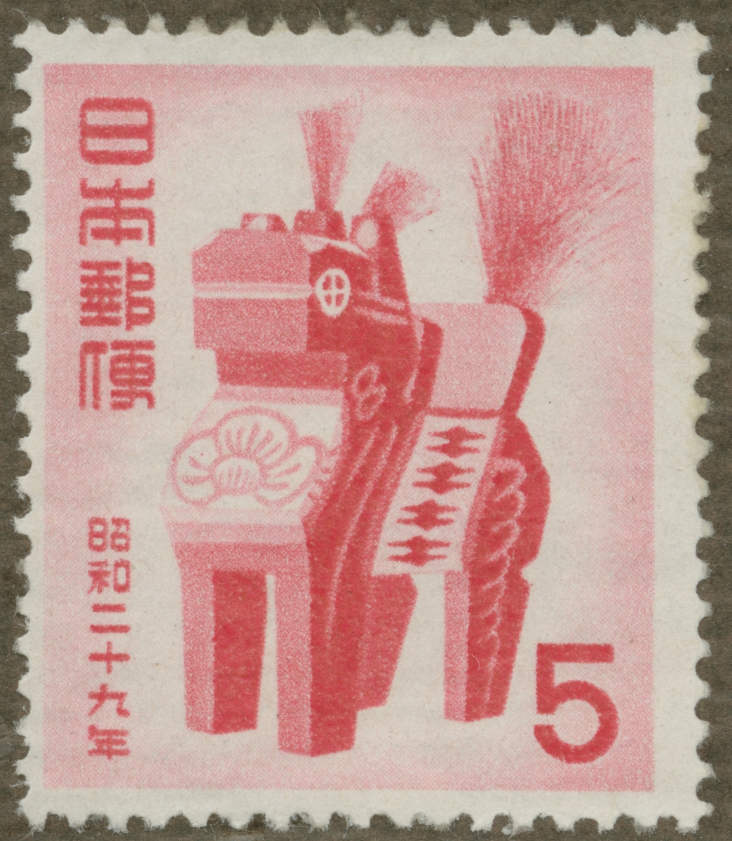 Frimärke från Japan, 1953. Motiv av japansk leksakshäst så kallad miharugoma. "Frankering för nyårskort".