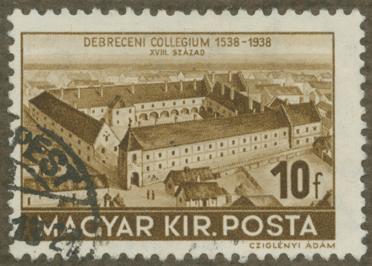 Frimärke från Ungern, 1938. Motiv av Ungerns Universitet i Debreczen på 1700-talet. "400-årsminne: 1538-1938".