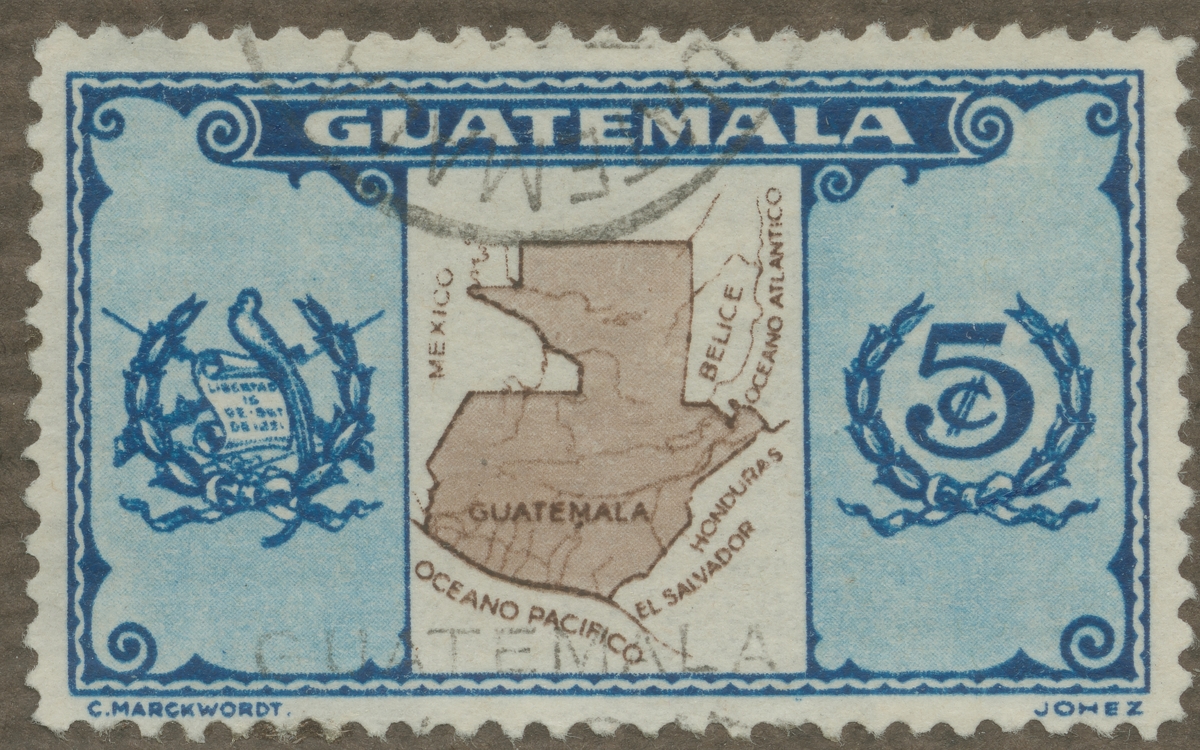 Frimärke från Guatemala, 1939. Motiv av karta över Guatemala.