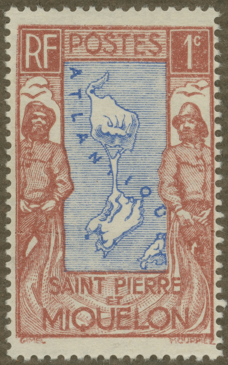 Frimärke från Saint Pierre et Miquelon 1932. Motiv av karta över Saint Pierre et Miquelon. Fiskare med nät.