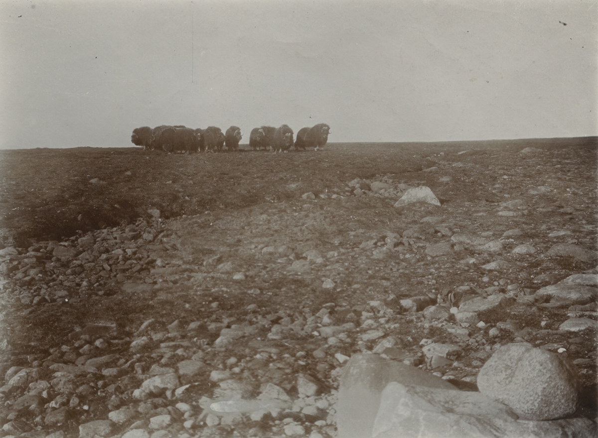 Fotografi från expedition till Grönland. Vy över kargt och stenigt landskap med en hjord av myskoxar i bakgrunden.