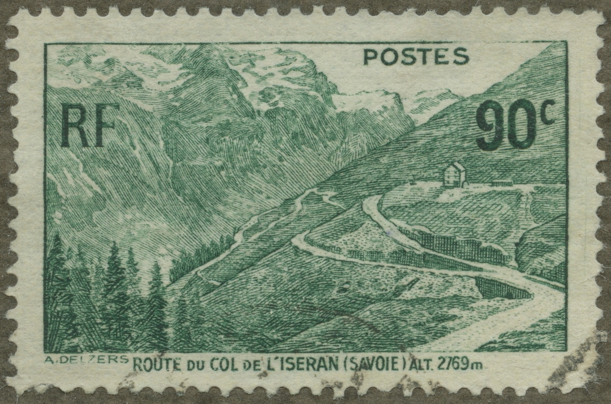 Frimärke från Frankrike, 1937. Motiv av Fransk vägbyggnad. Öppnandet av vägen på Col de l´Iseran.