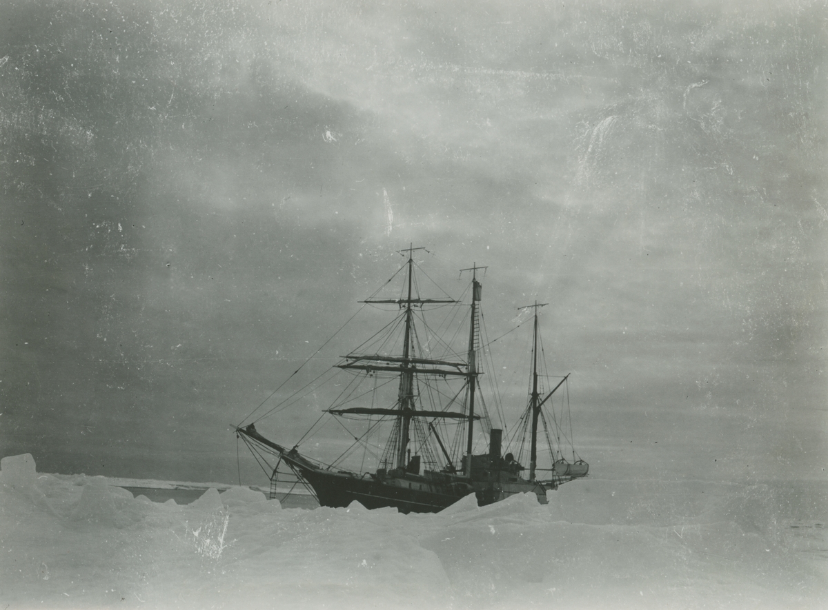Fotografi från expedition till Grönland. Motiv av stort fartyg som är omgivet av ett kargt snölandskap. Troligen är fartyget på bilden Antarctic vilken vid tiden ägdes av dansken Georg Carl Amdrup. Antarctic såldes år 1900 till Otto Nordenskjöld.