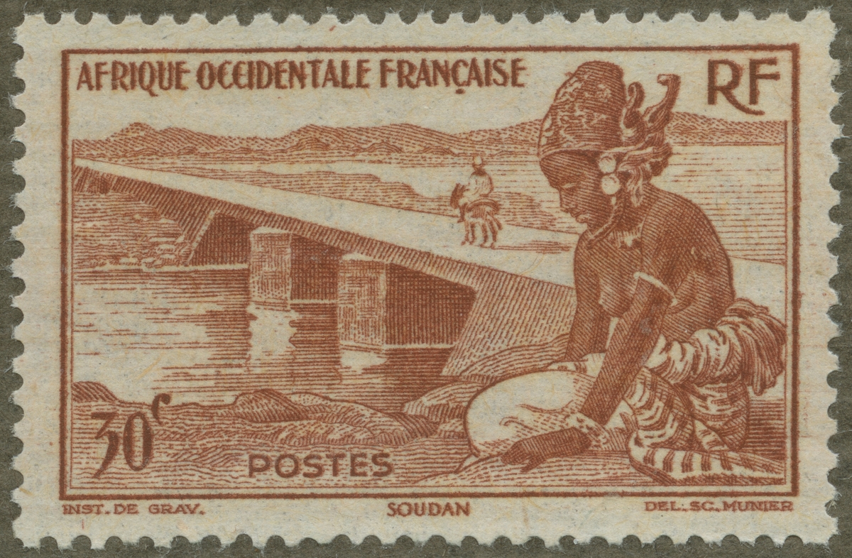 Frimärke från Franska Västafrika, 1945. Motiv av Bro i Soudan