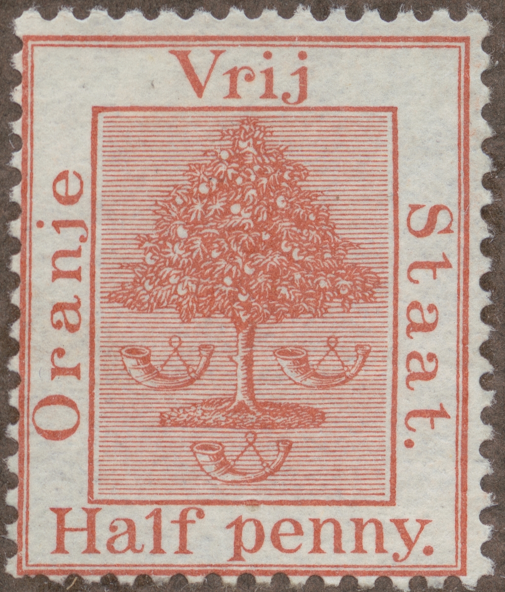 Frimärke från Oranje -Fristaten. Motiv av apelsinträd med frukter och posthorn.