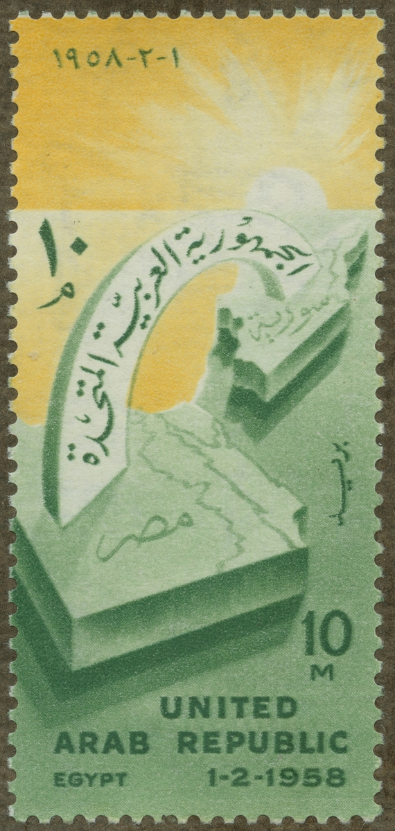 Frimärke från Förenade Arabnationer, 1958. Motiv av Bro förenande Egypten och Syrien 1.2.1958