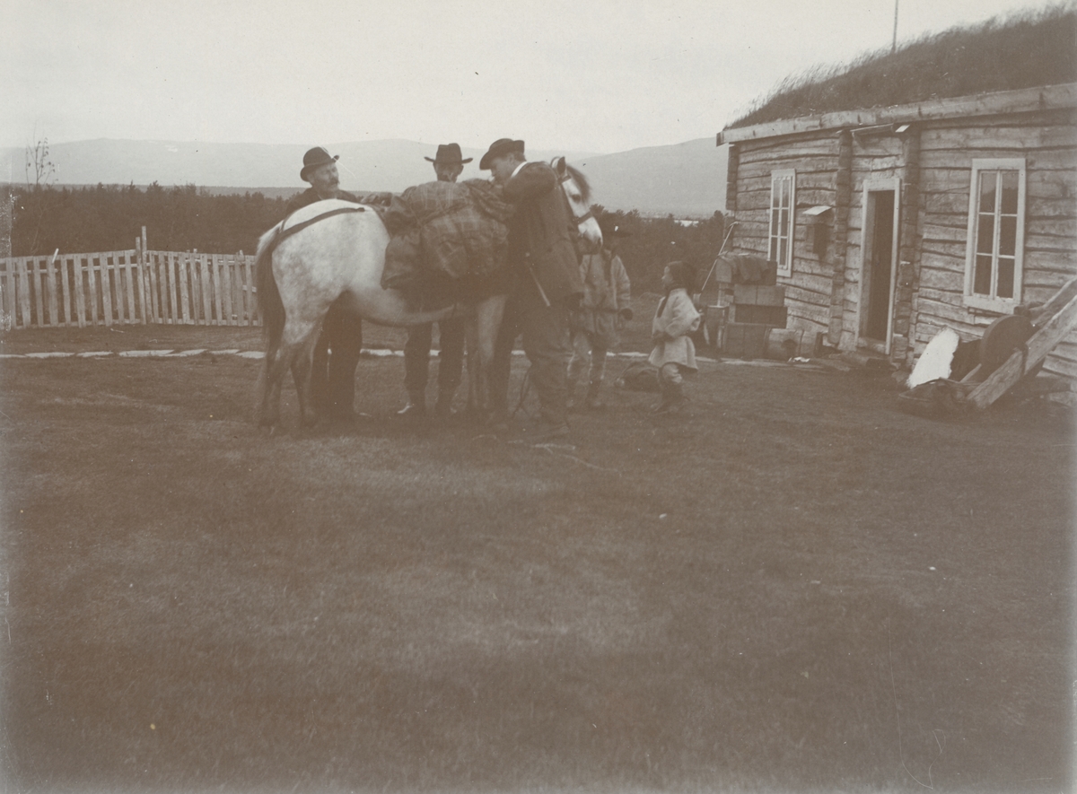Fotografi från expedition till Grönland. Motiv av tre män som inspekterar en häst. Bredvid dem står två små barn. På bilden syns även ett trähus med grästak.