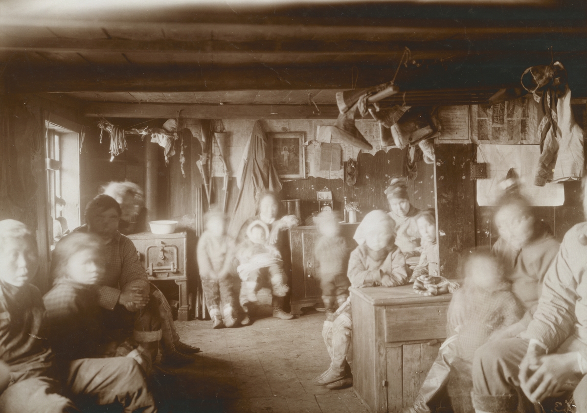 Fotografi från expedition till Grönland. Interiörbild från ett trähus. Motiv av ett antal vuxna och barn som sitter ner och tittar mot kameran. i Taket hänger några par kängor och på den bakre väggen hänger en tavla och ett gevär.