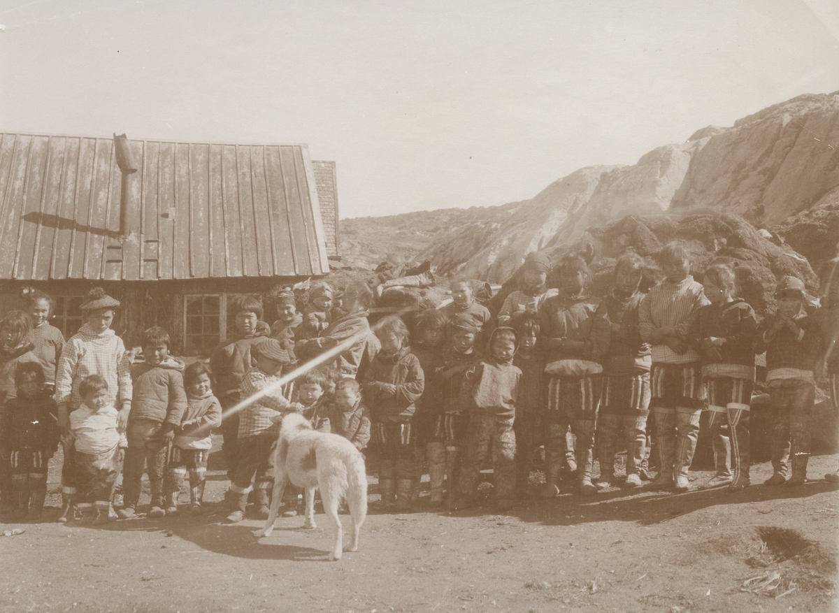 Fotografi från expedition till Grönland. Motiv av ett stort antal pojkar och flickor som står uppställda på ett led. I bakgrunden syns ett trähus och ett berg. Framför barnen står en hund. Fotografiet kan vara taget på ön Sarfannguaq.