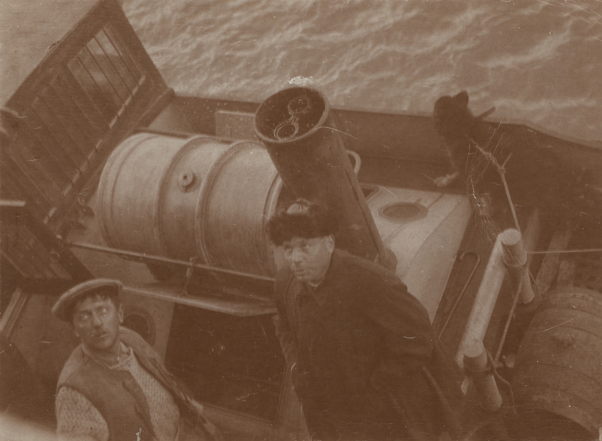 Fotografi från expedition till Spetsbergen. Motiv av två män på båt.