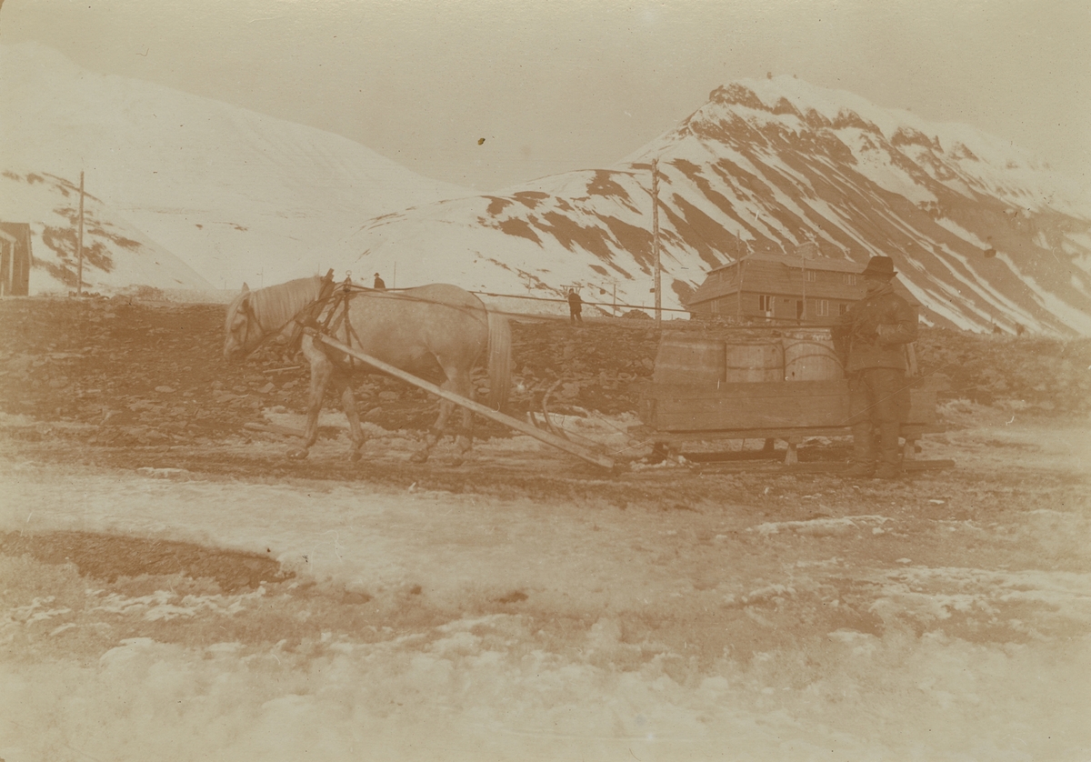 Fotografi från expedition till Spetsbergen. Motiv från Sveagruvan med häst som drar en släde.