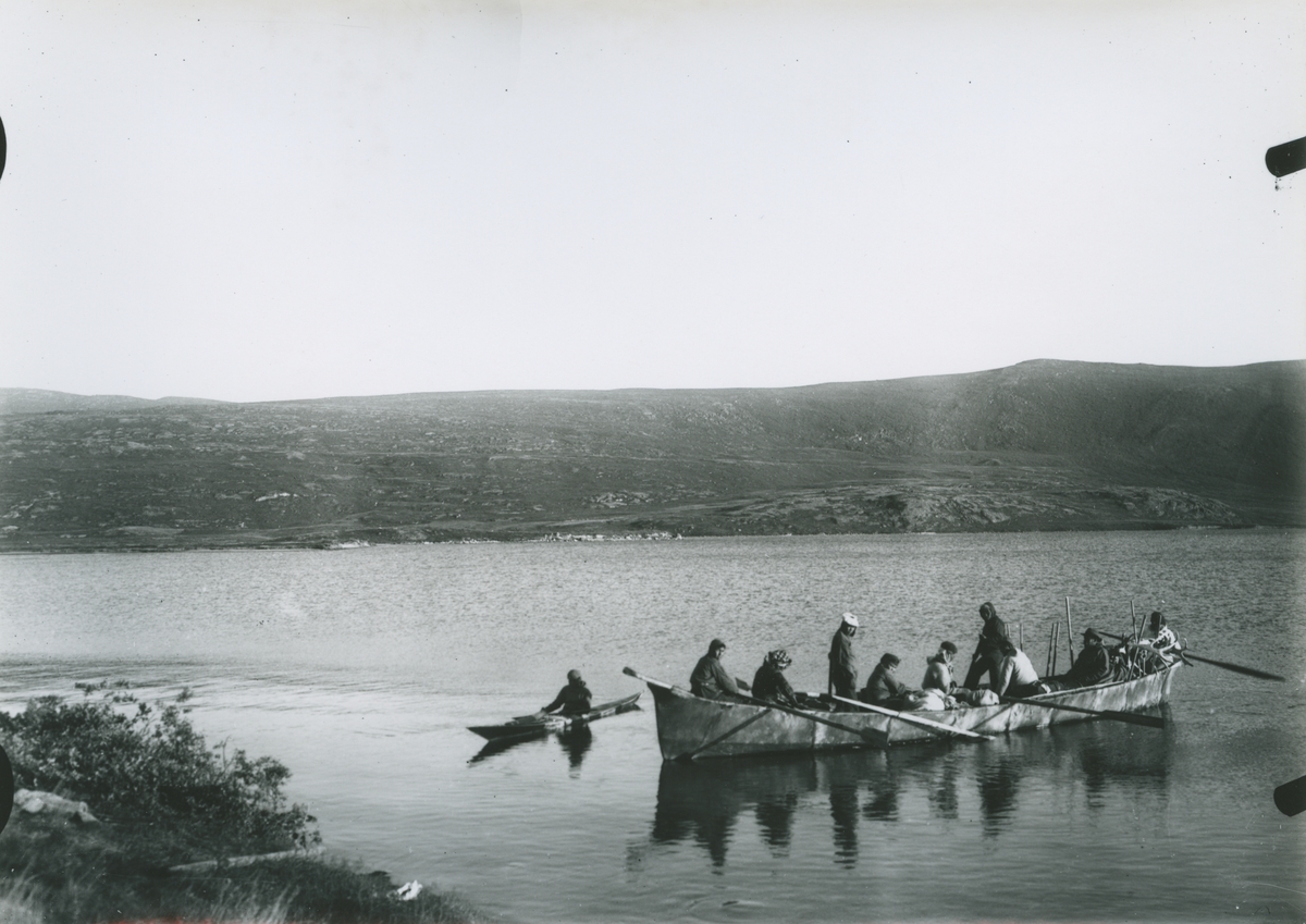 Fotografi från expedition till Grönland. Motiv av ett antal personer i en stor kanot och en person i kajak bredvid.