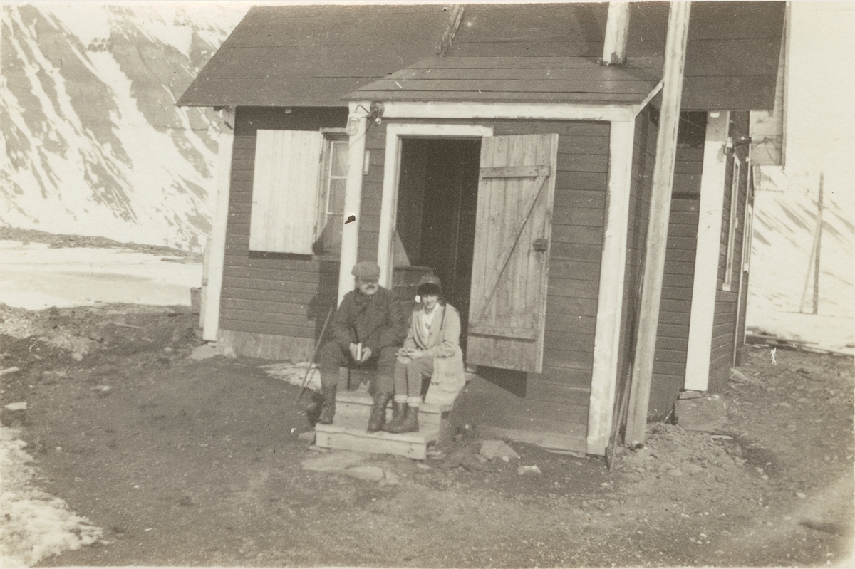Fotografi från expedition till Spetsbergen. Motiv av man och kvinna som sitter framför ett litet trähus.