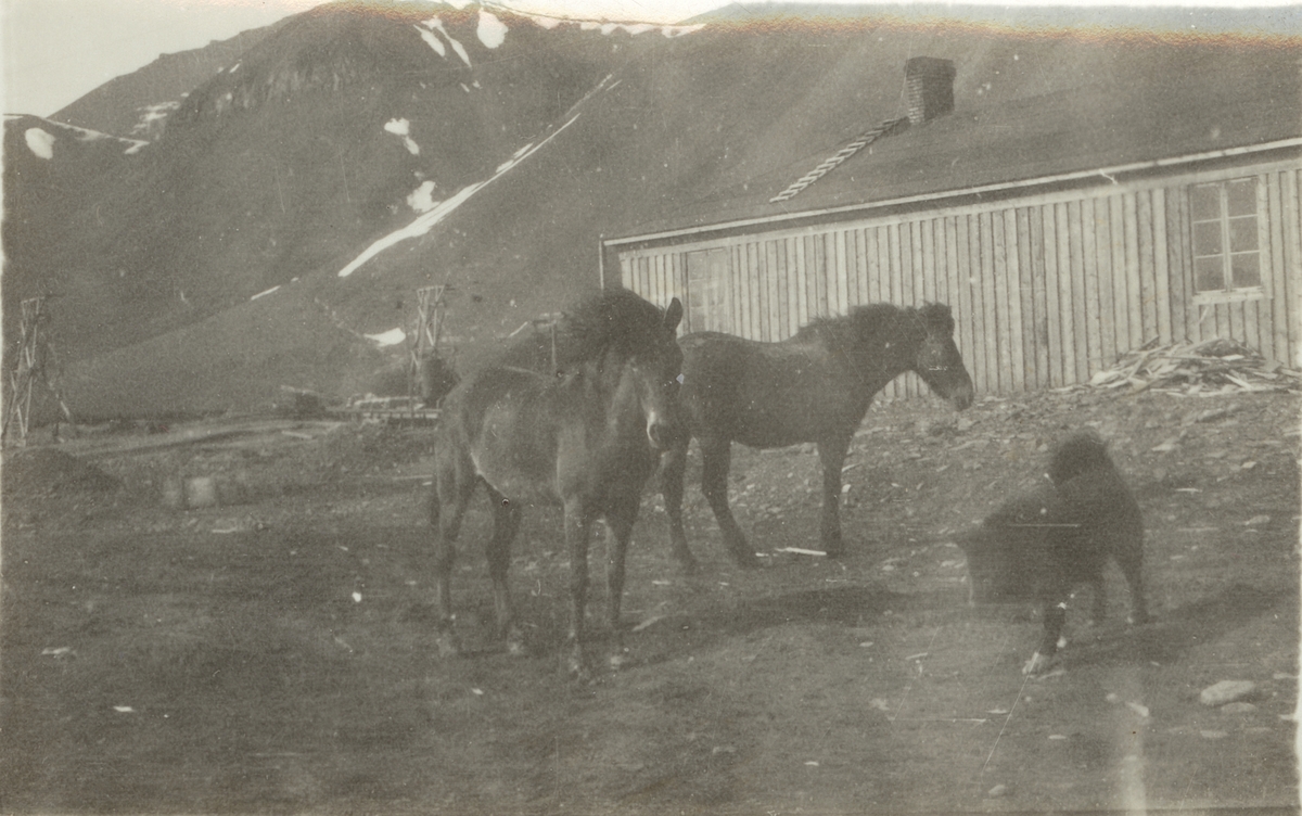 Fotografi från expedition till Spetsbergen. Motiv av två hästar och en hund utanför ett trähus.