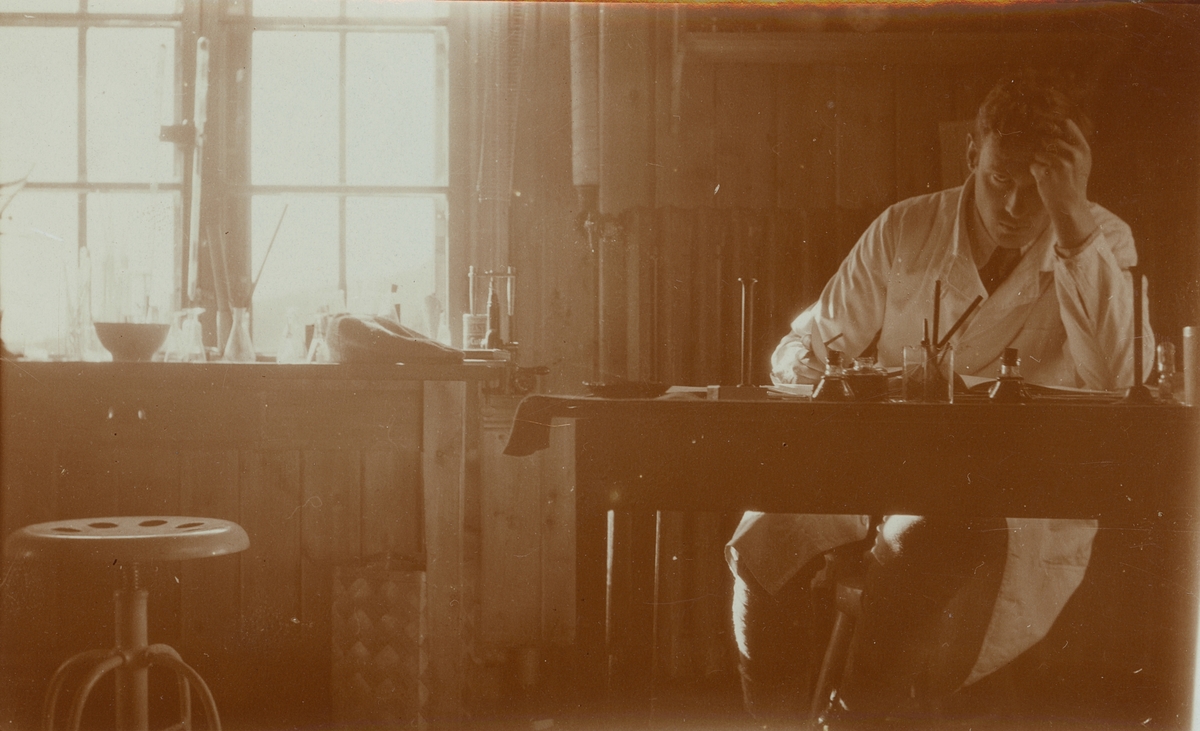 Fotografi från expedition till Spetsbergen. Motiv av man i vit rock (läkarrock?) som sitter bakom ett skrivbord.