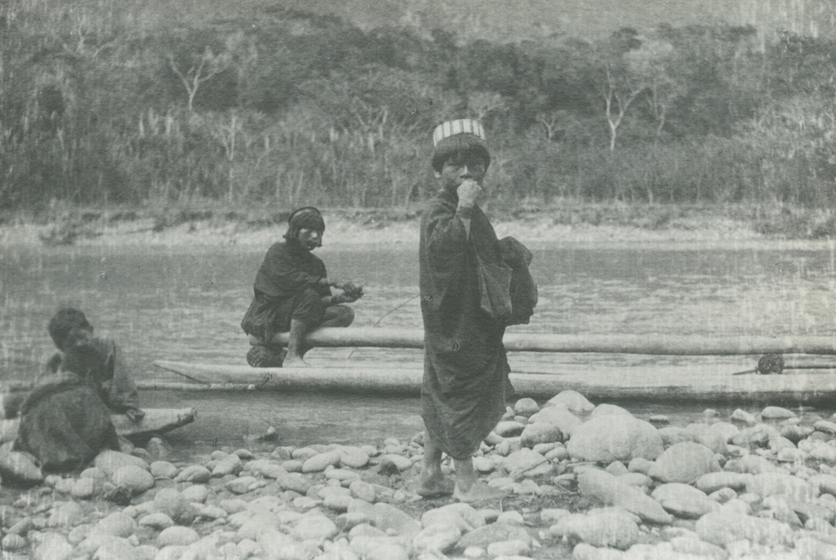 Fotografi från expedition till Peru 1920. Motiv av man och pojkar vid flod i djungeln.
