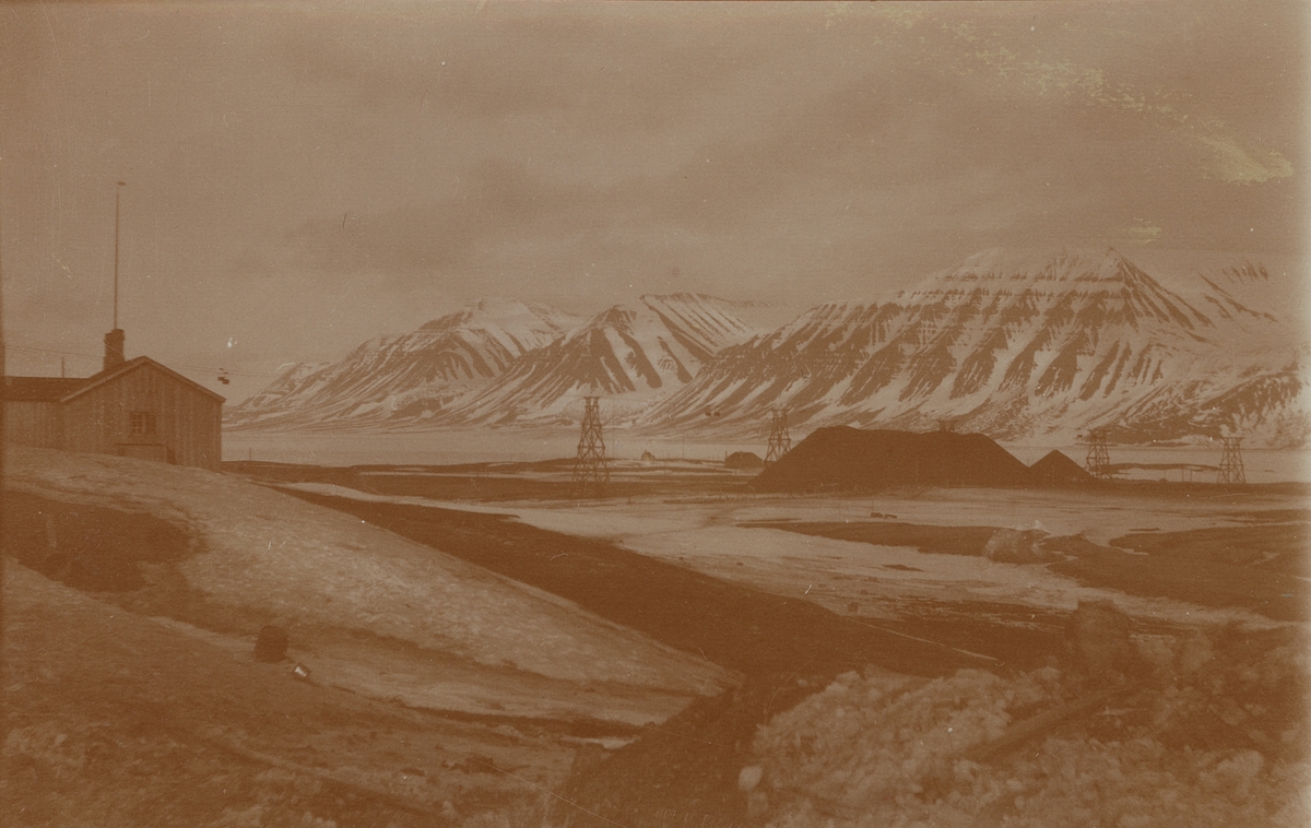 Fotografi från expedition till Spetsbergen. Vy över Sveagruvan med ståtliga snötäckta berg i bakgrunden.
