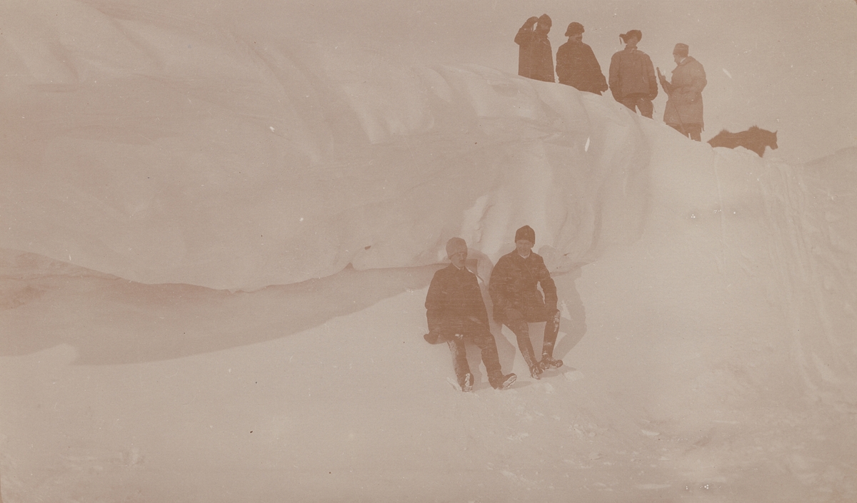 Fotografi från expedition till Spetsbergen. Motiv av en grupp män i snön.