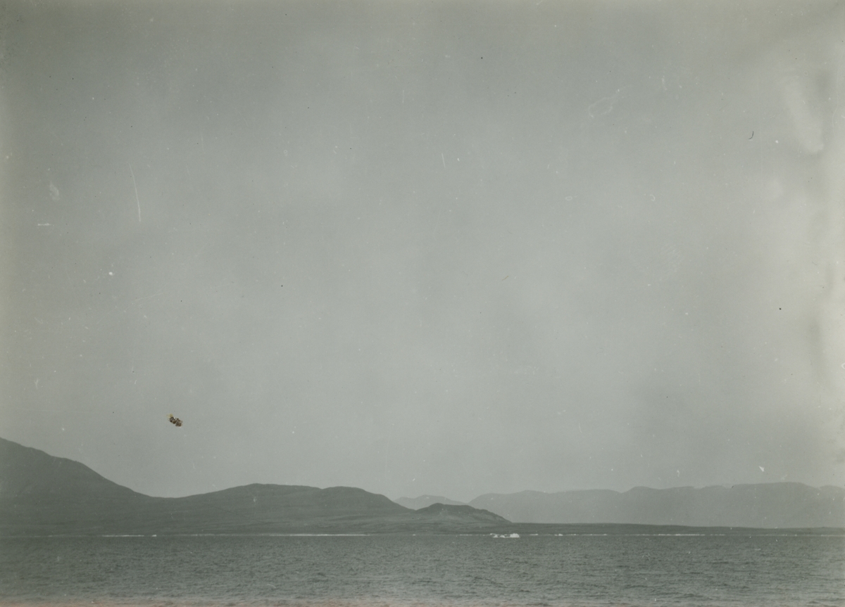 Titel: Fotografi från expedition till Östgrönland 1929. Dansk-svensk expedition under ledning av Lauge Koch. Svenska deltagare: Oscar Kulling och Helge Backlund. Vy över hav, berg och himmel.