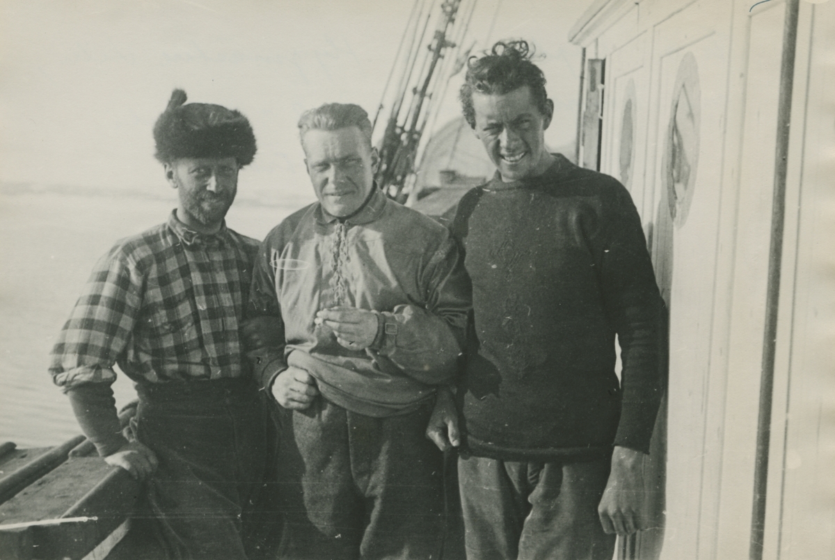 Fotografi från svenska undsättningsexpeditionen 1928. Motiv av expeditionsdeöltagarna Sora, Lilu och van Dongen ombord på fartyg.