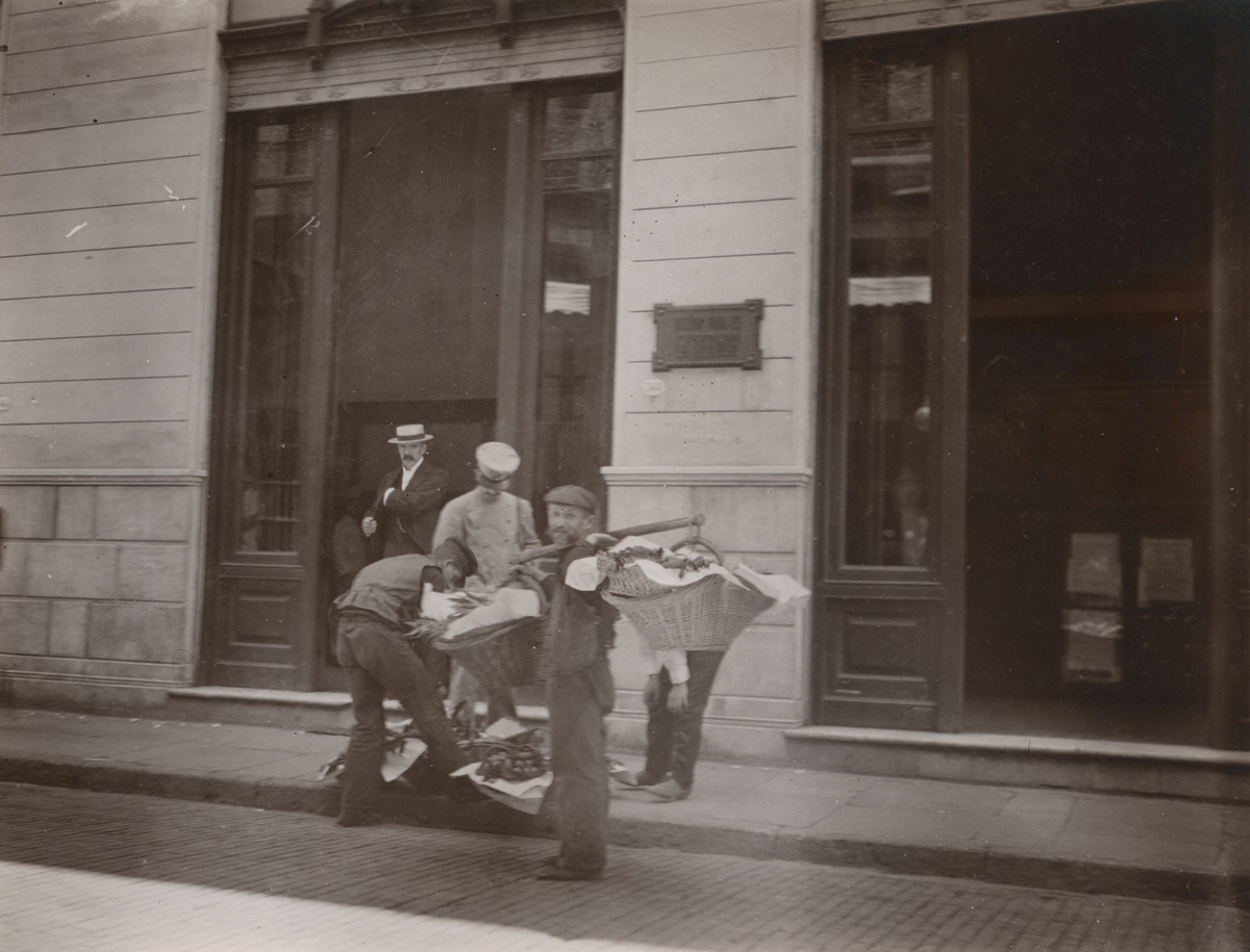 Fotografi från expedition till Peru 1920. Motiv av expeditionsdeltagare framför affär i stad.