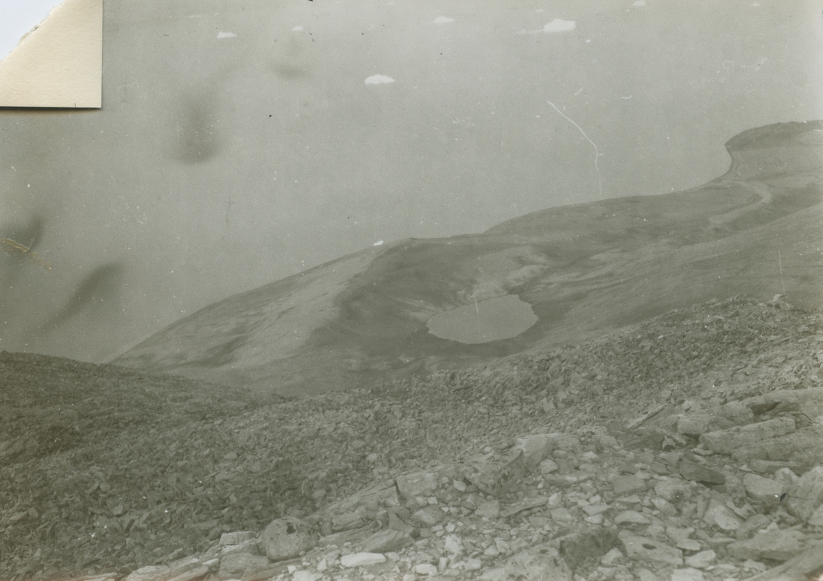 Fotografi från expedition till Östgrönland 1929. Dansk-svensk expedition under ledning av Lauge Koch. Svenska deltagare: Oscar Kulling och Helge Backlund. Vy över ett stenigt och isigt bergslandskap.