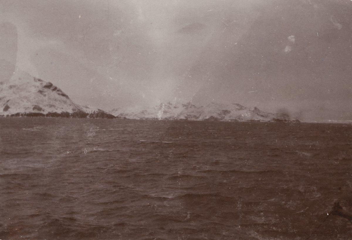Titel: Fotografi från första svenska Antarktisexpeditionen 1901-1904. Vy över hav och snötäckta berg.