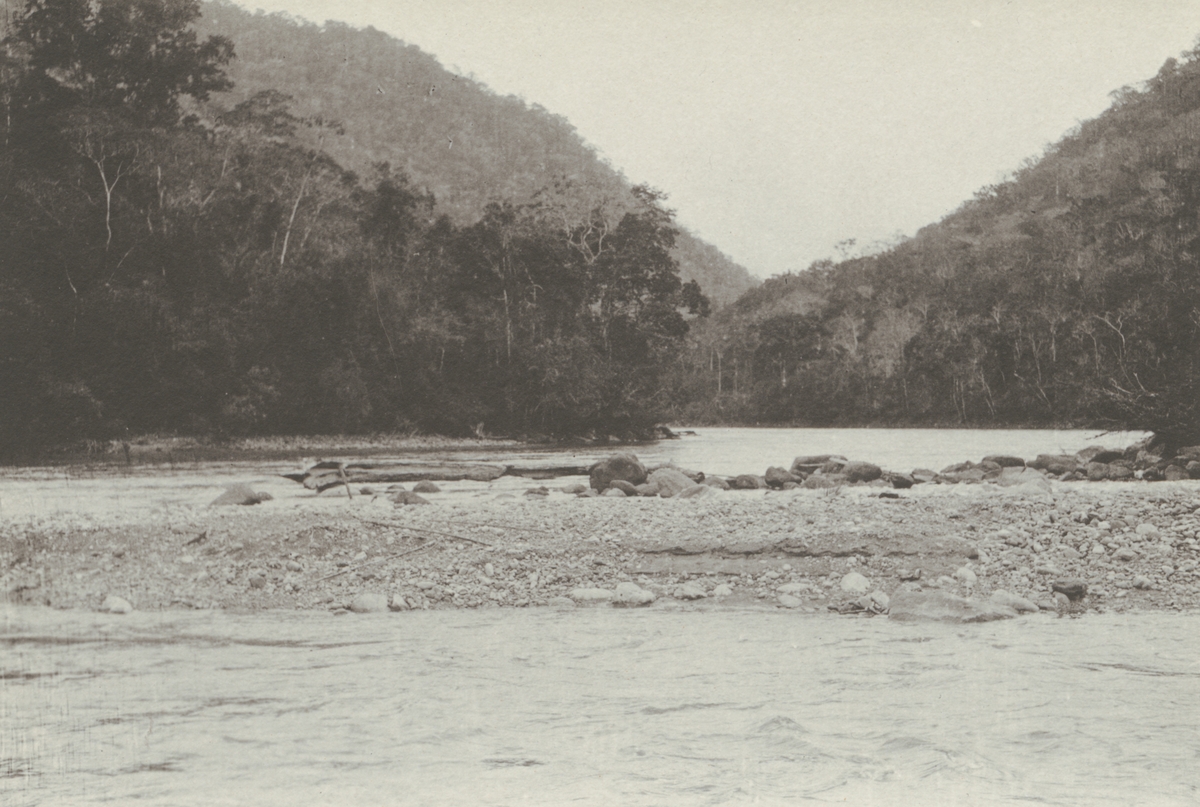 Fotografi från kuvert märkt med "Ernst Nordenskjöld". Motiv av flod som rinner genom djungel.