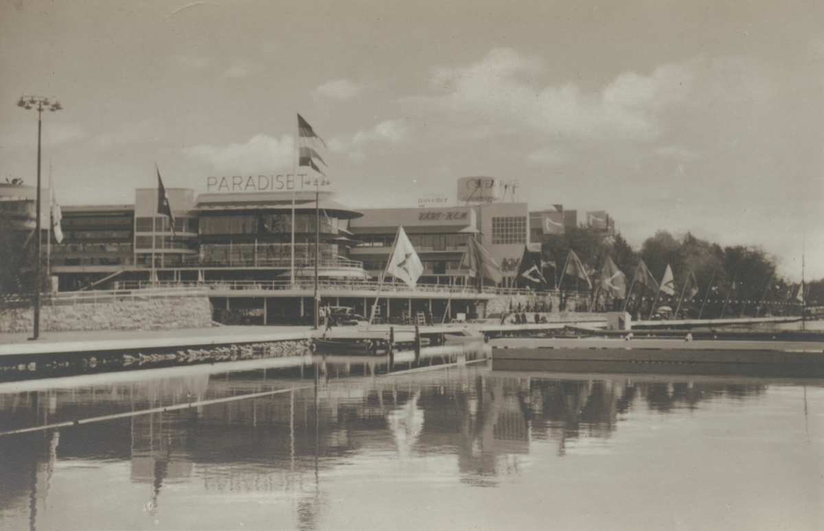 Fotografi från Stockholmsutställningen 1930. Motiv av huvudrestaurangen, himmel och moln.