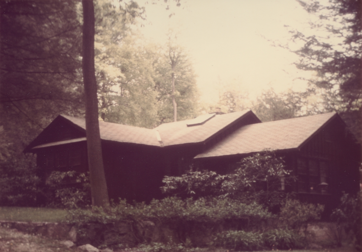 Fotografi från låda märkt Bernt Balchen. Balchen var norsk-amerikansk flygare, polarforskare och militär. Motiv av hus i skog.