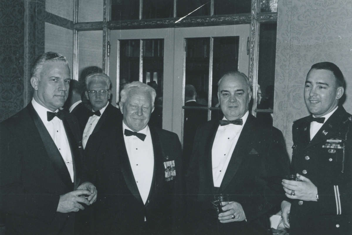 Fotografi från låda märkt Bernt Balchen. Balchen var norsk-amerikansk flygare, polarforskare och militär. Motiv av fyra män i smoking på Explorer's Club Dinner på Waldorf Astoria i New York 1968. Mannen näst längst till vänster är Bernt Balchen.