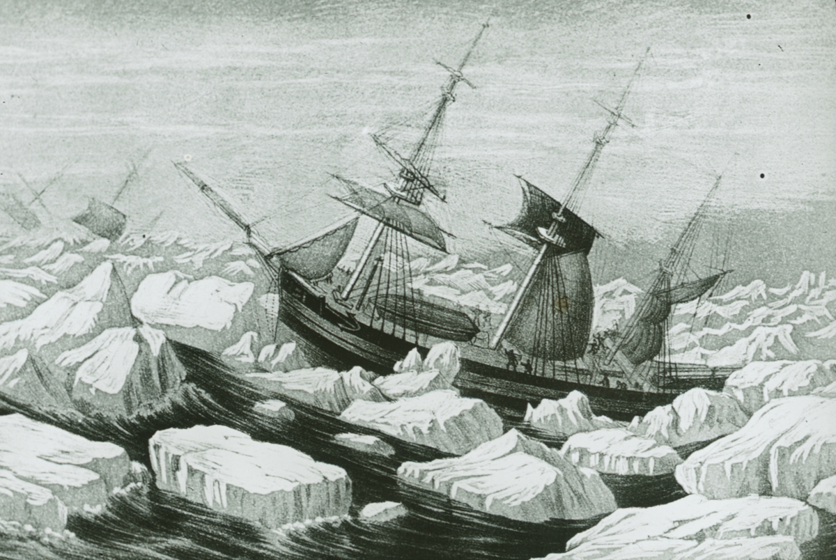 Fotografi från Grönland. Målad bild av skepp bland isberg.