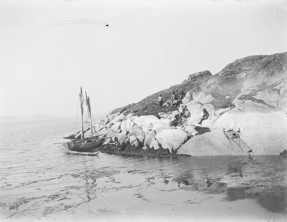 Fotografi från Grönland. Motiv av män på litet berg med båt nedanför.