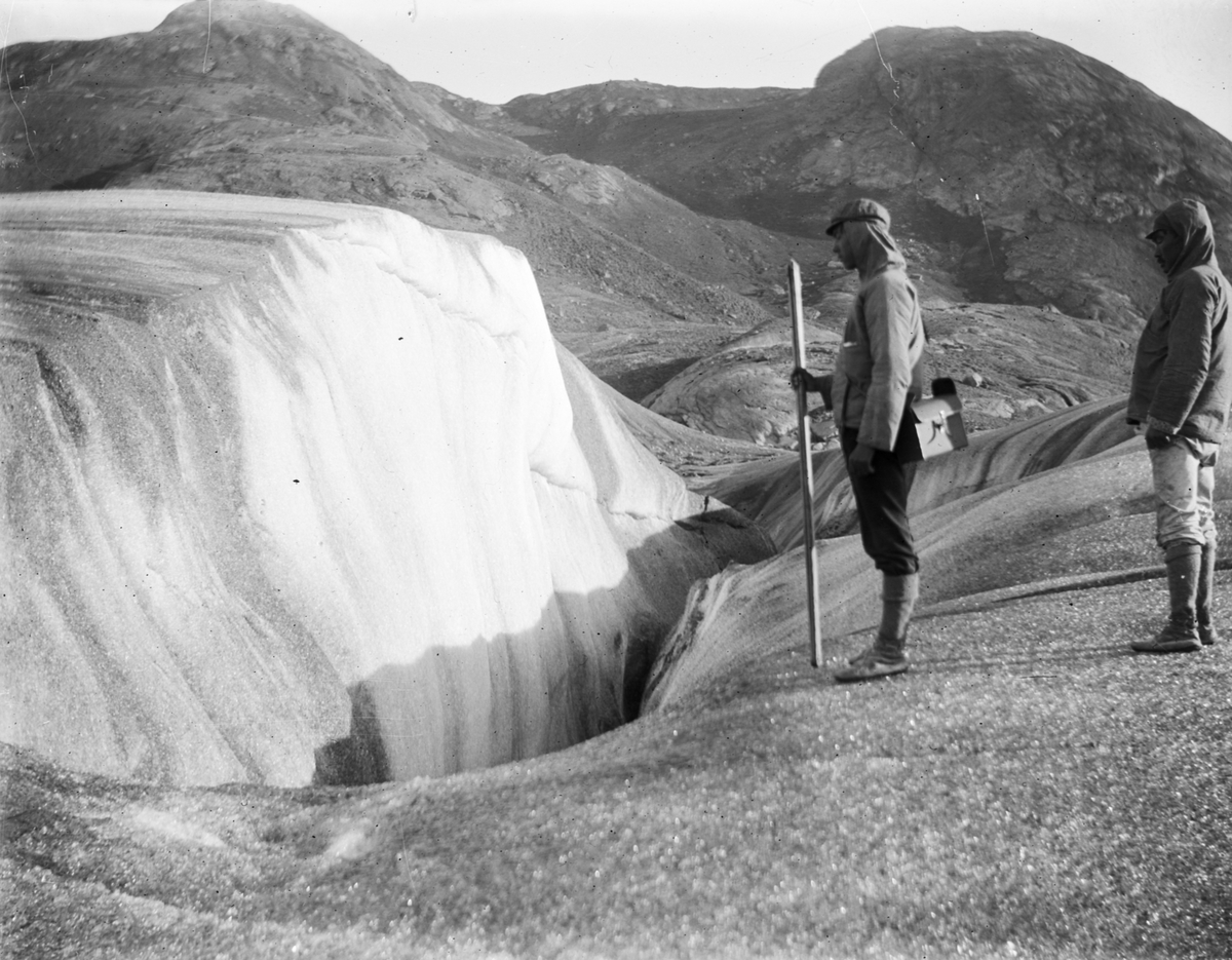 Fotografi från Grönland. Motiv av två män i bergslandskap.