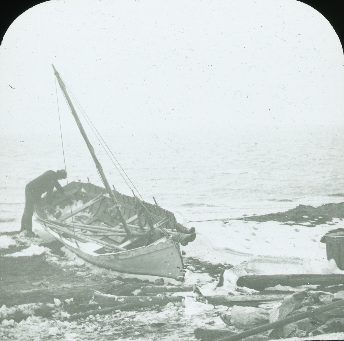 Fotografi från expedition till Spetsbergen. Motiv av man med fiskebåt på strand.
