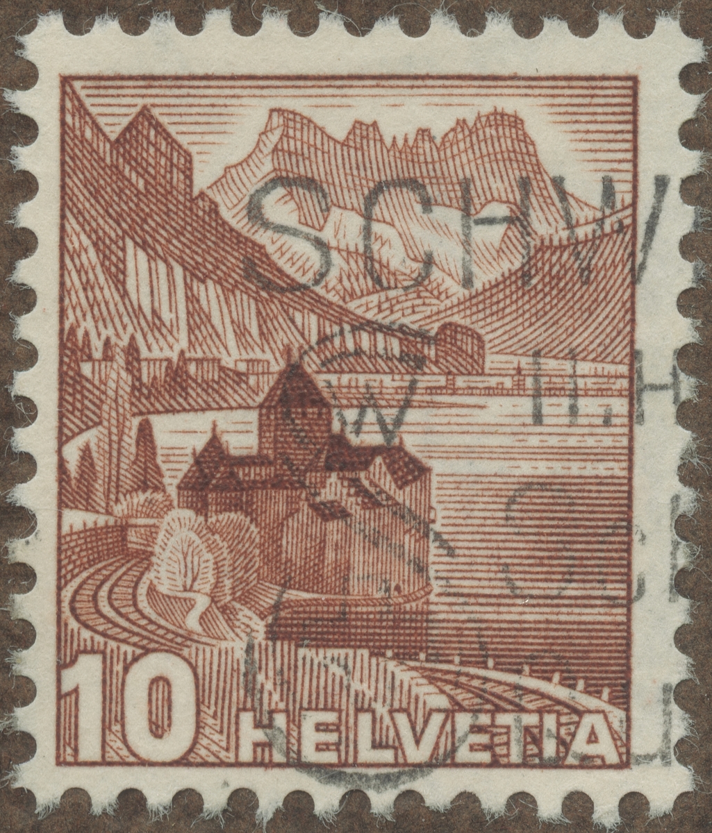 Frimärke från Schweiz, 1936. Motiv av Slottet Chillon från 1200-talet Vid Genèvesjön nära Montreux