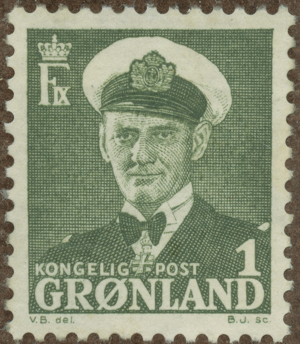 Frimärke från Grönland, 1950. Motiv av Konung Frederik IX av Danmark f. 1899- g.m. prinsessan Ingrid av Sverige 1935.