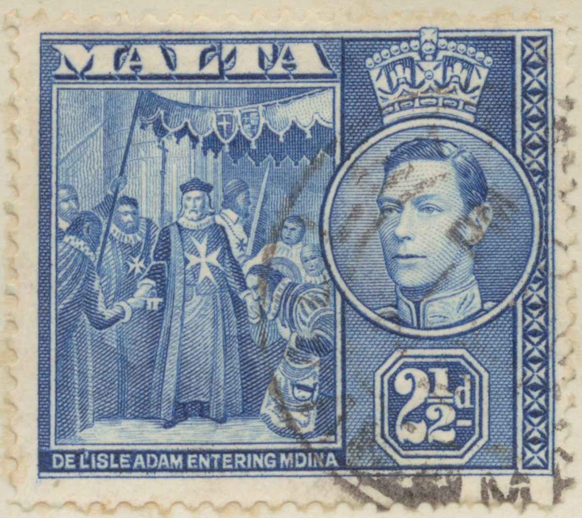 Frimärke från Malta, 1938. Motiv av Krona (t.v.): De l'Isle Adam:s ankomst till Mdina. (t.h.): Kung George VI av England