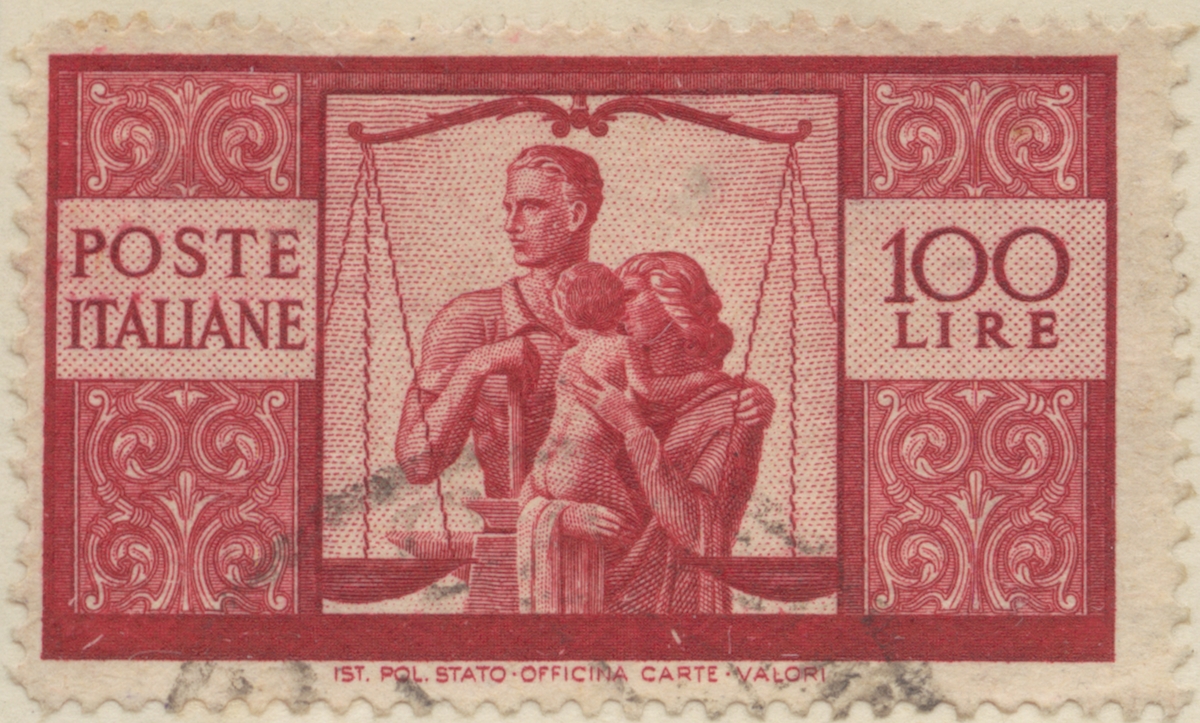 Frimärke från Italien, 1946. Motiv av Återförenad arbetare familj. Vågskål. Symbol: Återuppbyggande efter världskrig II.