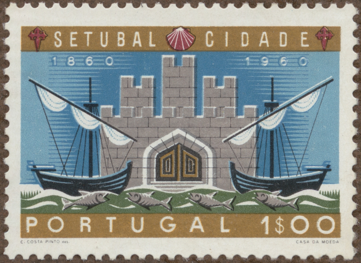 Frimärke från Portugal, 1961. Motiv av Staden Setubals Stadsvapen Fisk, båtar, byggnader Setubal 100 år: 1860-1960.