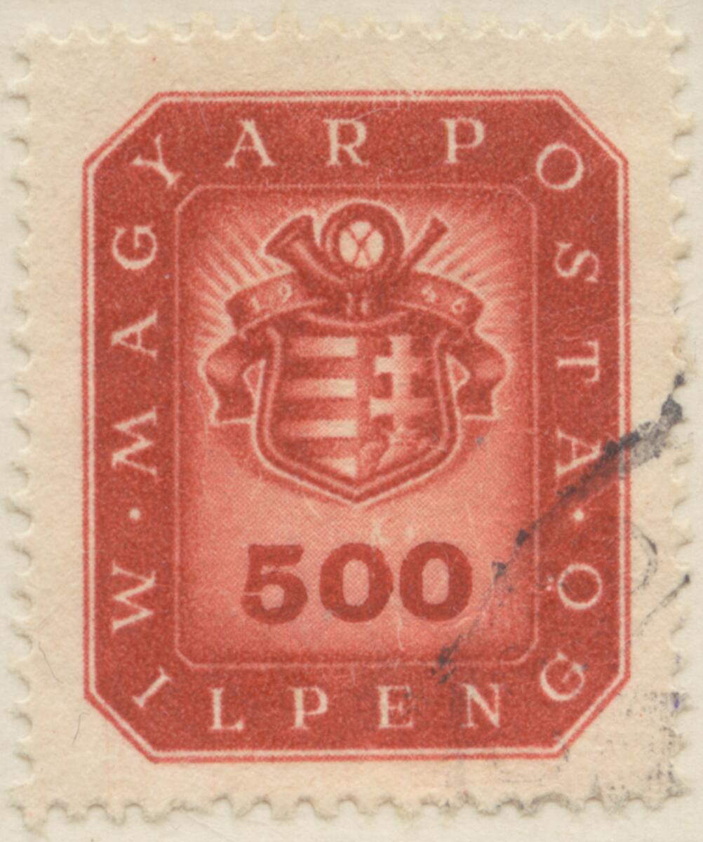 Frimärke från Ungern, 1946. Motiv av Ungerns vapen och posthorn