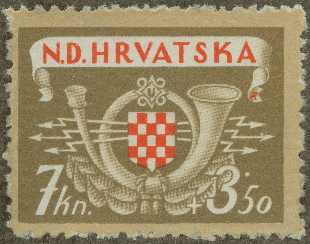 Frimärke från Kroatien, 1944. Motiv av Posthorn Postsymboler "Serie för P.T.T."