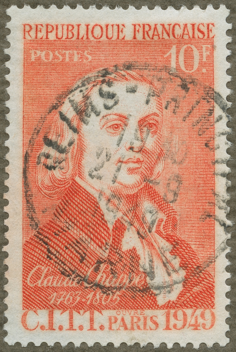 Frimärke från Frankrike, 1949. Motiv av Claude Chappe 1763-1805 Uppgjorde år 1792 planen för ett optiskt signalsystem, som fick namnet "telegraf"